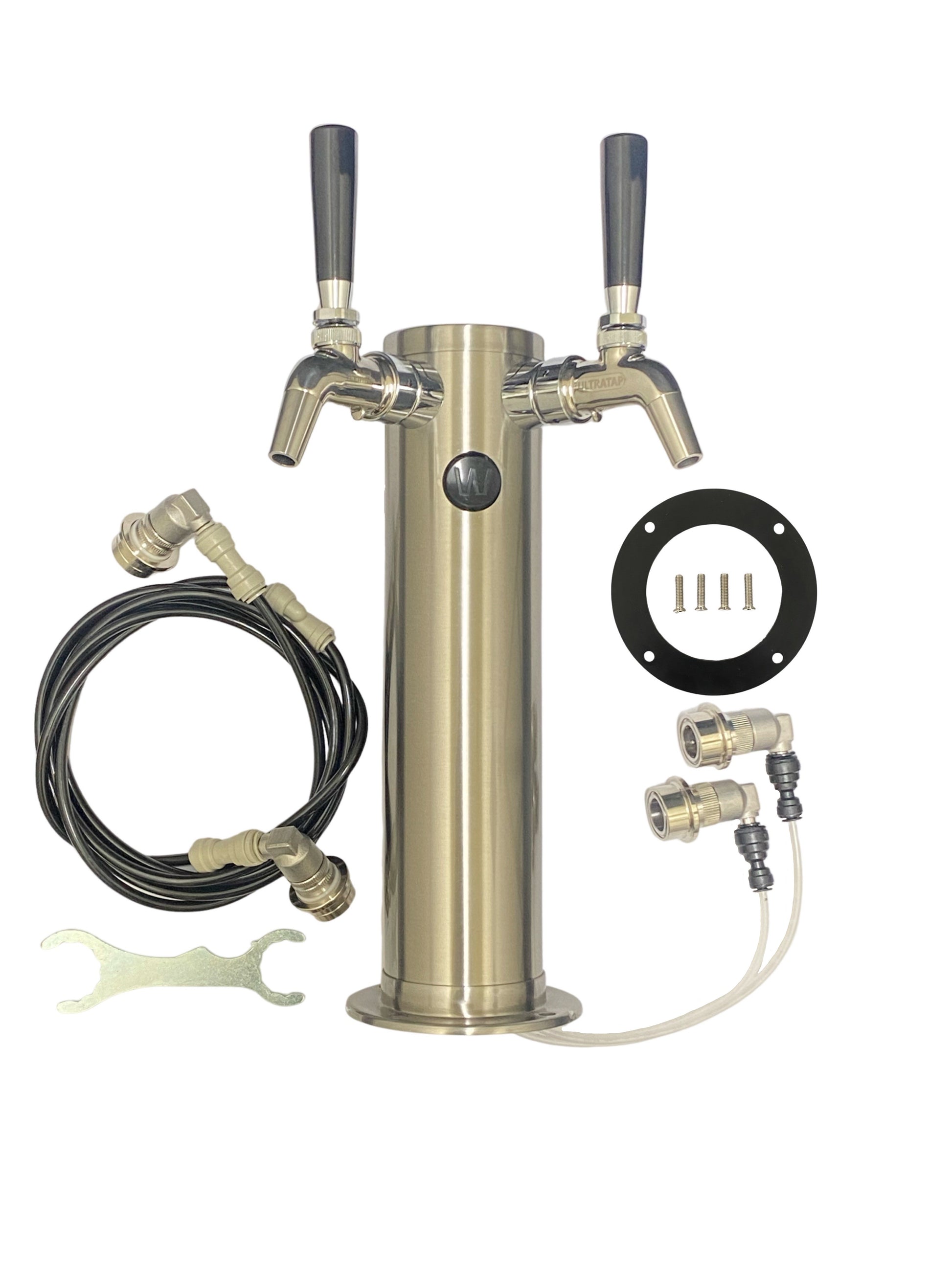 What's included: - Stainless steel gas and liquid disconnects and tubing for two kegs - Double Tap Brushed Stainless Steel Font Kit (with 2 Ultratap Taps) - Rubber gasket for Font - Tool for installing tap and regulator. A Co2 Cylinder and Regulator will be required.